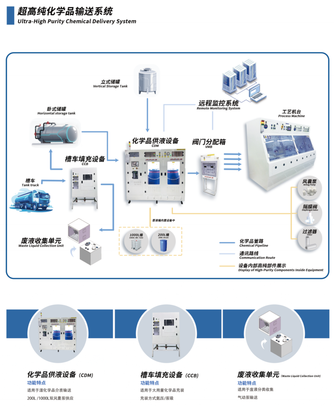提供半导体装备制造、气体输送设备(如 BSGS、GC、GR 等)、化学品输送设备(如CDM、CCB 等),以及电子特气集中供应、湿电子化学品集中输送等制程关键系统的解决方案。